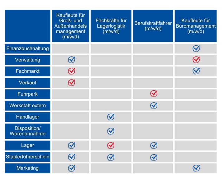In der Tabelle sind alle Bereiche unseres Unternehmens aufgeführt. Dort kannst du sehen, welche Bereiche du hauptsächlich kennen lernen wirst.